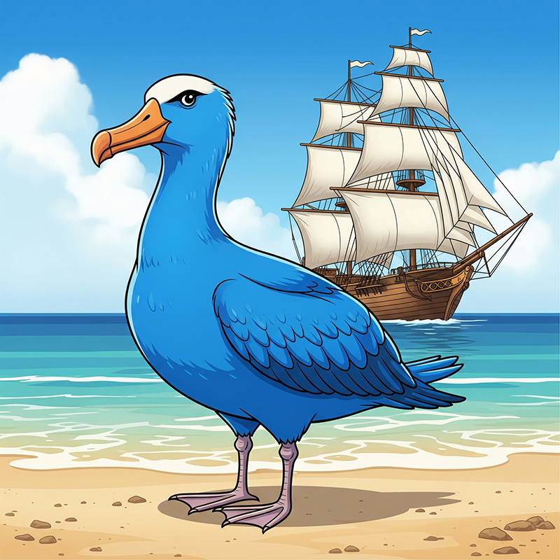 On deck, Jack informed Stephen that his bird had disgraced itself on the quarterdeck again, and had been obliged to be led away. The bird (in fact an albatross), tame from the egg, had become so accustomed to human companionship that it chose rarely to exercise its powers of flight. It could be seen creeping about the waist, looking repentant... Stephen, knowing that brutish superstition still governed the minds of most seamen, had taken the precaution of dipping the creature in waterproof ink before bringing it aboard, and announcing that it was a Giant Blue Swiss Seagull, one of the rarest of avians... On reflection, he wished he had named a country with a coastline. He was about to ask Jack whether it had been treated with consideration when it was led away — its feelings could be delicate at times — when a voice called out from above: